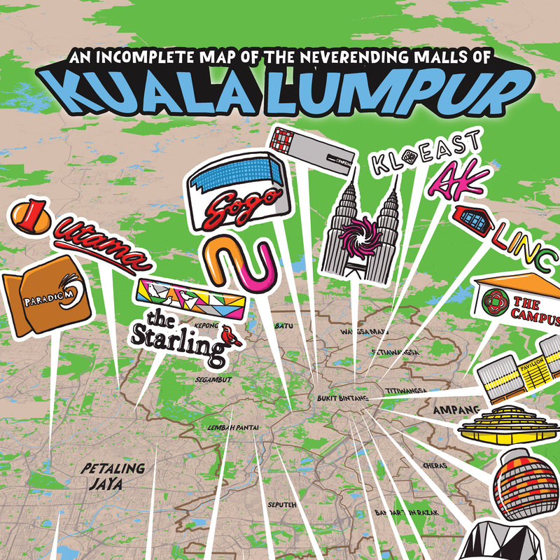 A new and updated print edition of this tongue-in-cheek map for coping with the overabundance of mall in Kuala Lumpur, Malaysia.